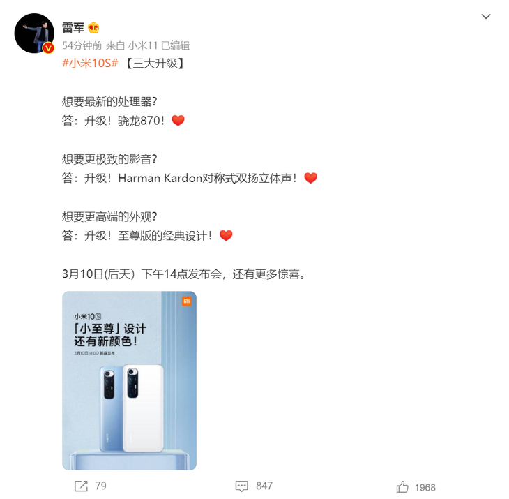 / 小米10S - DXO排行榜又要變天,小米10S相機將獨占多項新功能,對標P40 Pro - 壹讀 - 小米10、小米10 pro核心配置完全一致:骁龙865、lpddr5 高速内存、ufs 3.0高速存储。 此外,两款手机均采用双1216超线性扬声器,双smart pa 大音量外放,等效1.2cc x 2 超大音腔设计。