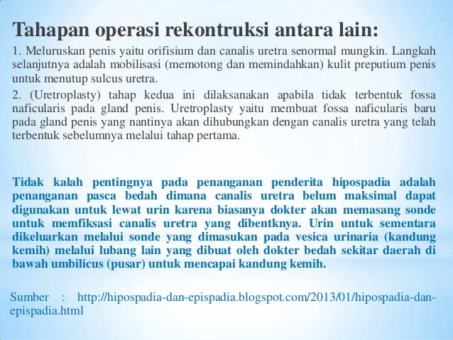 Lalu, apa yang dimaksud hipospadia? Lalu, apa yang dimaksud hipospadia? El resultado es que el meato urinario se localiza en algún lugar en la parte inferior del glande o tronco, o más atrás, como en la unión del escroto y pene. Hipospadia adalah cacat lahir (kondisi bawaan) di mana pembukaan uretra berada di bagian bawah penis, bukan di ujung. Bagi beberapa orang mungkin hipospadia adalah sebuah istilah yang cukup asing karena kondisi penyakit ini tak banyak diketahui.